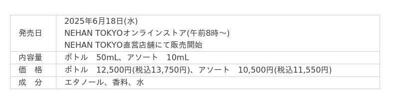 さらに、NEHAN TOKYO初の香水ライン「オードゥパルファン」も、このタイミングで登場。