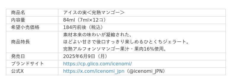 江崎グリコ株式会社は、ぎゅっと凝縮された素材の濃い味わいが特長の、ロングセラーブランド「アイスの実」から、旬の完熟アルフォンソマンゴーを使用した「アイスの実<完熟マンゴー>」を2025年6月9日(月)より全国発売します。