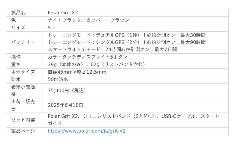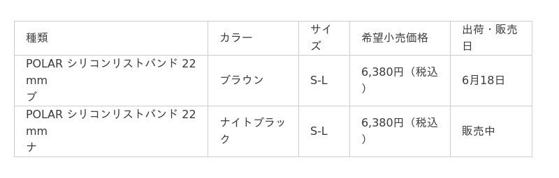 Grit X2は6月5日よりポラールのオンラインストアで予約受付を開始いたします。またオンラインを含む全国のポラール製品正規取扱店で6月18日から販売を開始いたします。希望小売価格は75,900円(税込)、カラーはナイトブラック、カッパー・ブラウンの2色展開、S-Lサイズとなっています。またカッパー・ブラウンの交換用22mmのリストバンドも同時発売いたします。S-LサイズにはSとM/Lの2サイズのリストバンドが同梱されています。