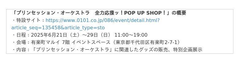 株式会社ディー・エヌ・エー(本社:東京都渋谷区、代表取締役社長兼CEO:岡村 信悟、以下 DeNA)は、現在放送中のオリジナルTVアニメ『プリンセッション・オーケストラ』のポップアップショップを有楽町マルイ 7階にて、2025年6月21日(土)~29日(日)の期間限定で開催することをお知らせします。DeNAの主催のもと、グッズおよびイベントの企画から実施までを一貫してプロデュースしています。