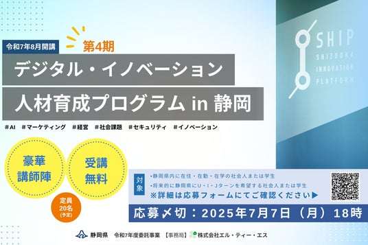 株式会社エル・ティー・エス(本社:東京都港区、代表取締役:樺島 弘明/以下、LTS)は、静岡県の「令和7年度バーチャルサテライトキャンパスを核としたイノベーション拠点『SHIP』ソフト事業及びスタートアップ支援相談窓口業務委託」を受託しました。つきましては、デジタルを活用したビジネスの創造や変革が可能なトップレベルのデジタル人材の育成を目指し、静岡県内の社会人または学生向けに、必要な知識・スキルを実践的に習得できる講座を、今年度も開講いたします。