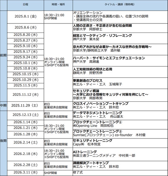 本講座は、7カ月に渡って、前期(「デジタルを活用したビジネス創造や変革の専門家による講義」)、中期(「各領域の知識を組み合わせ新たな価値を生み出す仕組みを実践的に学ぶワークショップ」)、後期(「社会課題解決の実行力を高めるトレーニング」)の三構成で各分野の大学教授等や企業のデジタル専門家等の講義を受けられる講座となっています。
