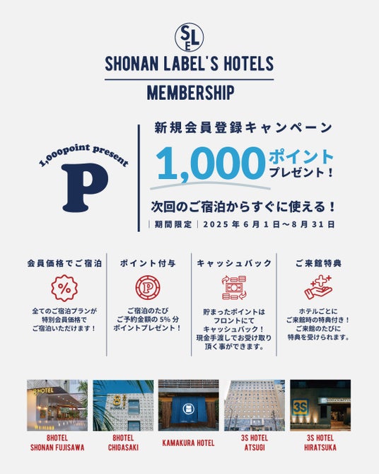 株式会社DD グループの連結子会社である湘南レーベル株式会社(本社:神奈川県藤沢市/代表取締役社長:楠目 圭佑)は運営する5つのホテル(8HOTEL SHONAN FUJISAWA ・ 8HOTEL CHIGASAKI ・ KAMAKURA HOTEL ・ 3S HOTEL ATSUGI ・ 3S HOTEL HIRATSUKA)で2025年8月31日(日)までの期間に、 新規会員登録していただくと1,000ポイントプレゼントをするキャンペーンをスタートいたします。