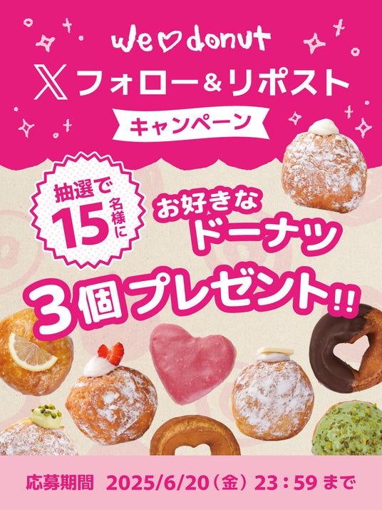 株式会社サンパーク(本社:吹田市岸部北、社長:高木 健)が運営する生ドーナツ専門店『we(ハート)d onut(WeLoveDonut /ウィーラブドーナツ)』より、2025年6月5日(木)より、抽選で15名様に「お好きなドーナツ3つ」が当たる「Xフォロー&リポストキャンペーン」を開催