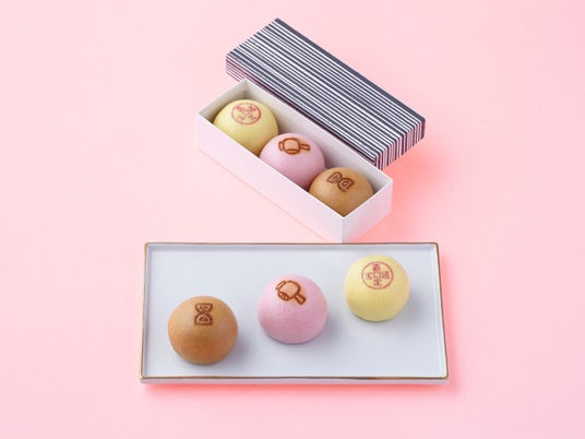 風味の異なる3種のお饅頭の詰め合わせです。嘉定通宝の意匠、小槌形の焼き印、「全国和菓子協会」マークの焼き印を押してあります。招福の願いが込められたおめでたいお菓子です。
