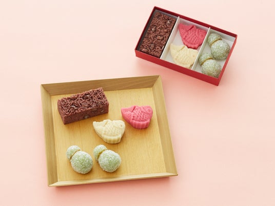 縁起の良いお菓子の中から3種を選び、小箱に詰め合わせました。招福の願いが込められたおめでたいお菓子です。