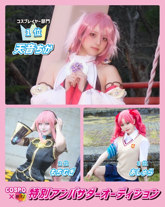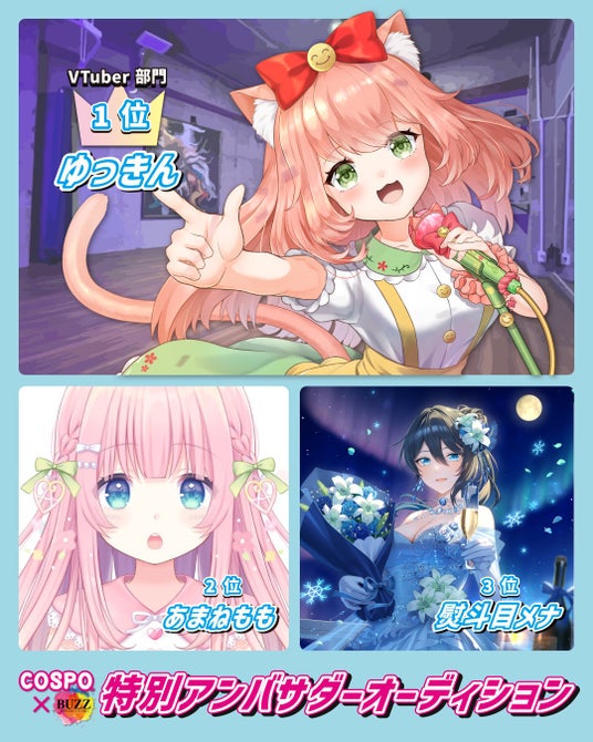 コスプレイヤー部門では天音ちか氏が1位、VTuber部門ではゆっきん氏が1位に選出され、メインアンバサダーとして就任します。また、各部門の上位3名、計6名が「COSPO×STUDIO BUZZ特別アンバサダー」に就任することが決定いたしました。
