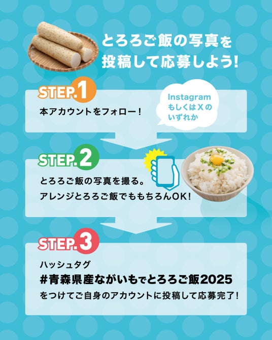 Instagram【青森いきいきやさいレディ(JA全農あおもり)】もしくはX【青森いきいきやさい】のアカウントをフォローし、 「とろろご飯」の写真をInstagramかXに投稿するだけで応募完了となります。投稿の際には「#青森県産ながいもでとろろご飯2025」をつけてください。