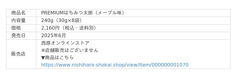「PREMIUMはちみつ太郎(メープル味)」は、全国の店頭では手に入らない、通販サイト<西原オンラインストア>限定・数量限定での特別販売です。▼「PREMIUMはちみつ太郎(メープル味)」商品ページはこちら