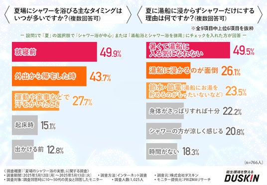 ・夏場のシャワータイミングは「就寝前」が約半数で最多、「帰宅時」「汗をかいたとき」も上位に。