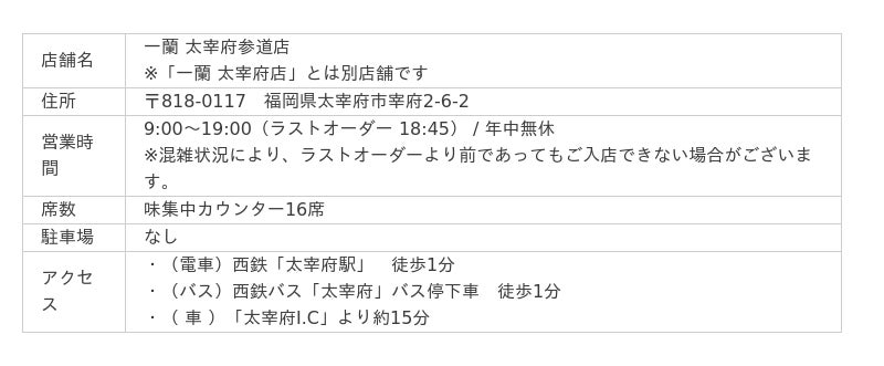 ・所在地 :〒810-0801 福岡県福岡市博多区中洲5-3-2 一蘭本社ビル