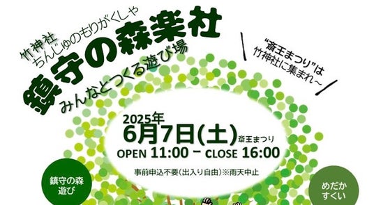 明和町の観光地域づくりを推進する一般社団法人明和観光商社(本社:三重県多気郡明和町、以下明和観光商社)が地域住民とともに活性化に取り組む竹神社にて、6月7日(土)、第42回斎王まつりの開催に合わせて「鎮守の森楽社」を実施します。当日は、竹神社の鎮守の森を開放し、子どもたちや来場者が自由に森遊びやさまざまな体験を楽しめる場を設けます。今後も地域コミュニティ主体で、自然や文化資源を活かした観光まちづくりを進めてまいります。