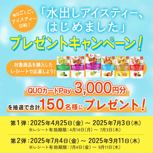 ・対象商品:日東紅茶「水出しアイスティー」シリーズ6品(アールグレイ12袋入り/20袋入り、トロピカルフルーツ12袋入り、はちみつレモン10袋入り、マスカットグリーンティー10袋入り、アップルルイボスティー10袋入り)
