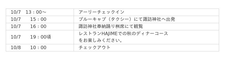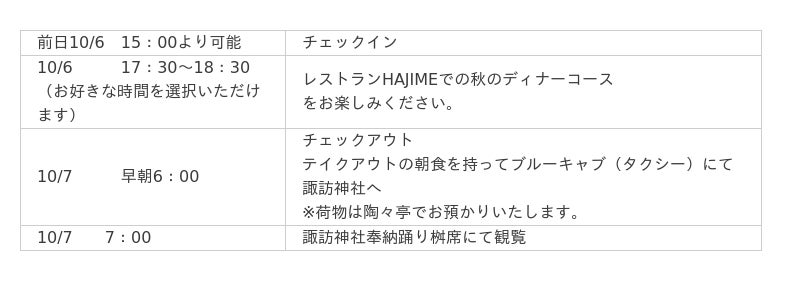 実施する諏訪神社での奉納踊りを観覧できる桝席チケット(S席、A席)付きの特別宿泊プラン。