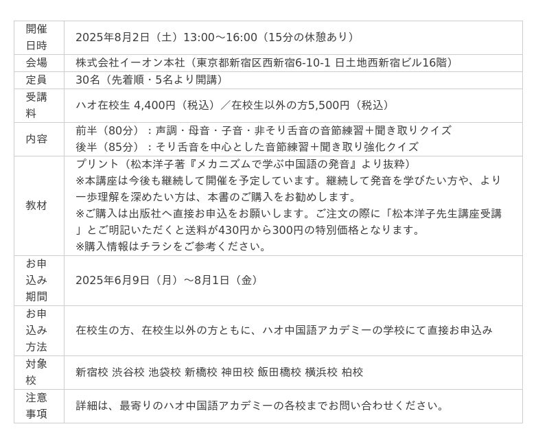 株式会社イーオン(本社:東京都新宿区、代表取締役社長:重野卓、以下「イーオン」)は、イーオンが運営するハオ中国語アカデミーの開校20周年を記念した特別企画第6弾として、2025年8月に松本洋子先生をお招きし、特別発音講座を開催いたします。