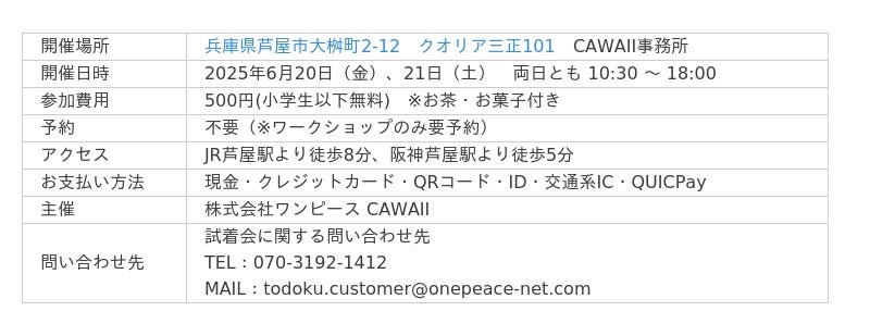 レディースアパレル通販を運営する株式会社ワンピース(本社:兵庫県加古川市、代表取締役:春木晃子)は、2025年6月20日(金)・21日(土)の2日間、CAWAII試着会&マルシェを開催します。