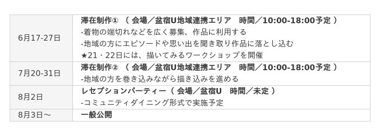 また、アート作品の制作は秋田県南在住の絵画作家である永沢碧衣氏が盆宿Uに滞在しながら公開で行います。このプロジェクトを通じて地域の活性化に貢献できるよう、施設を訪れる方々を巻き込みながら進めていくと共に、参加型クラウドファンディングで広く支援を募り、関係人口の創出を目指します。