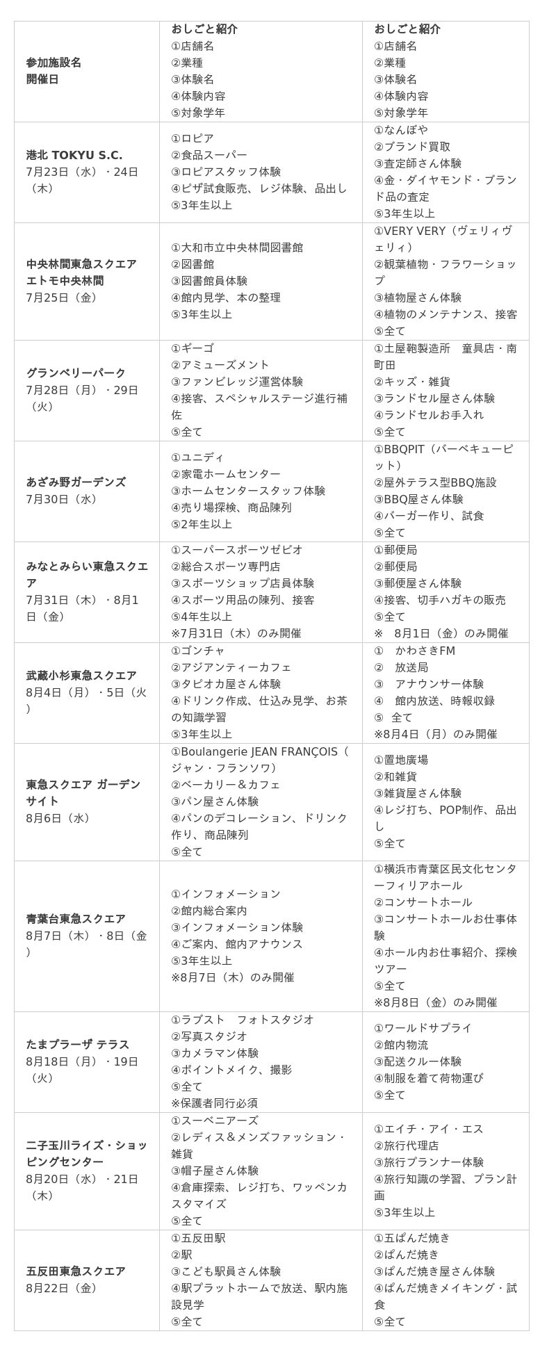 当社が運営する全12施設で、物販や飲食、サービス業などの店舗でのスタッフ業務だけでなく、SCを運営する上で欠かせない施設警備や館内物流、インフォメーションの他、東急電鉄7駅での駅員業務、地域に根差したSC運営により日頃から連携している図書館や郵便局など身近な施設での業務体験が可能です。SCならではの幅広いラインアップにより、おしごと体験数216枠(対象人数688名)を用意し、子どもたちの夢が広がるようなおしごと体験の場を提供します。当企画は、例年ご好評により募集人数を大きく上回るご応募をいただいており、今年は新たに『TOKYU CARD』『TOKYU POINT CARD』をお持ちの方は当選確率が2倍に上がる特典をご用意しました。
