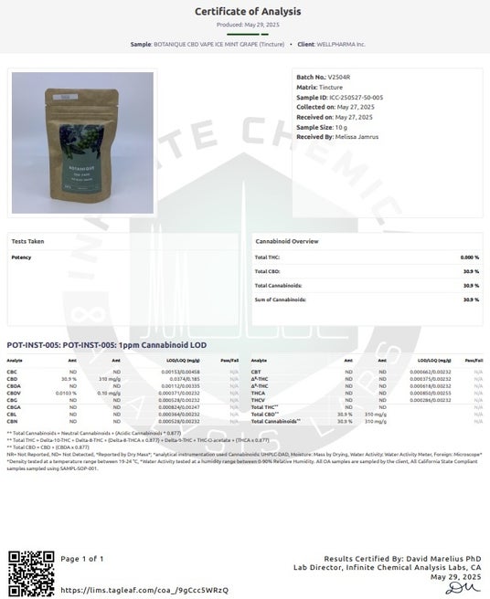 ▼BOTANIQUE CBDべイプ アイスミントグレープの成分検査表