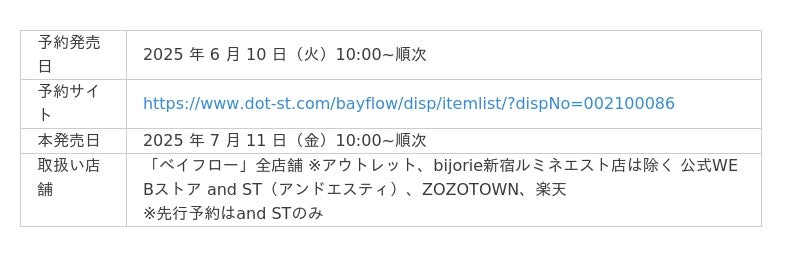 株式会社アダストリア(本部︓東京都渋谷区渋谷 2-21-1、代表取締役社長︓木村 治)が展開す るライフスタイルブランド「BAYFLOW(ベイフロー)」とモデルでタレントの近藤千尋さんがプロデュースする ブランド「AJUGA.(アジュガ)」が初のコラボレーションを展開し、親子でお揃いコーディネートができるウィ メンズとキッズアイテムが登場します。2025 年 6月10日(⽕)より公式WEBストア and ST(アンドエ スティ)で先行予約を開始します。また、2025 年 7月11日(金)よりBAYFLOW全店舗と公式WEB ストア and ST(アンドエスティ)、ZOZOTOWNにて通常販売をスタートします。