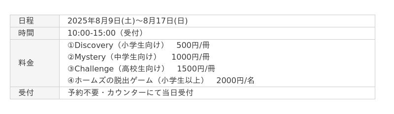中世英国の街並みを再現した施設全体を舞台に、参加者は探偵気分で手がかりを頼りに謎の解明に挑みます。ゲーム内の指令書やヒントは全て英語で展開されるため、楽しく英語に触れる機会になります。英語に触れながら本格ミステリーを楽しめる知的アクティビティとして、毎年好評を博しています。