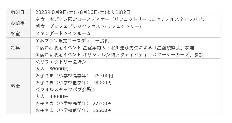 本プランでは、旬の食材を使用した特別ディナーや星空案内人・北川達彦先生による望遠鏡を用いた「星空観察会」などの特典で、豊かな自然と英国文化を満喫できます。中世英国の荘厳な建築様式やインテリアを忠実に再現した客室は、全室にクーラー・冷蔵庫・ウォシュレット付きトイレ・無料Wi-Fiを完備しており、長期滞在やファミリー利用でも快適に過ごせます。