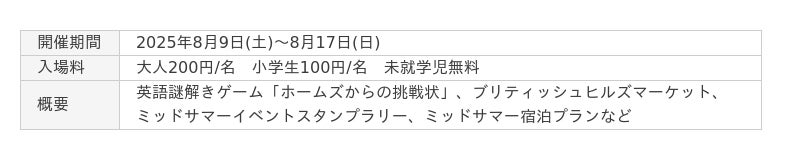 神田外語グループが運営する宿泊施設兼国際研修センターのブリティッシュヒルズ(福島県天栄村)は、2025年8月9日(土)~8月17日(日)まで、夏の特別イベント「ミッドサマーイベント」を開催いたします。イギリスのハイランド地方に似た冷涼な気候のブリティッシュヒルズは、避暑地として毎年多くの来訪者に親しまれています。本イベントでは、シャーロック・ホームズを題材にした英語の謎解きイベント、福島県内のハンドメイド作品の並ぶ「ブリティッシュヒルズマーケット」や豪華景品の当たるスタンプラリーなど、多彩なプログラムを実施。さらに、「星空観察会」などの宿泊者限定特典付きの「ミッドサマー宿泊プラン」もご用意しております。中世英国の街並みを再現した非日常空間で、大人も子どもも心に残る"涼しい夏の思い出"をお楽しみいただけます。