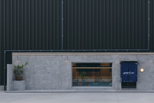 SHINDO LABの敷地内のウイスキー熟成庫の一角に埋め込むように建築。店舗からは熟成中のウイスキー樽をご覧いただけます。