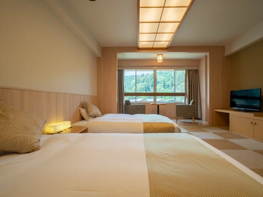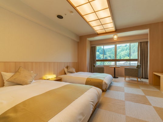 客室で温泉を愉しめる温泉半露天風呂付客室<かわみ>(2023年リニューアル)をはじめ、素足で過ごせる「和モダンツイン」客室などのベッドタイプの客室や、日本らしい従来の布団タイプの純和室などバリエーション豊かな客室があり、思い思いの時間をお過ごしいただけます。