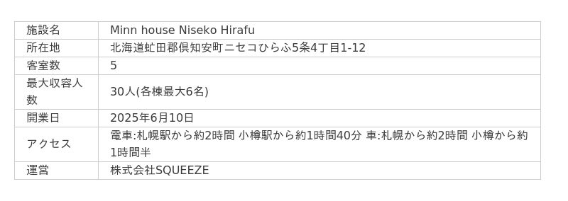 株式会社SQUEEZE(スクイーズ 本店:北海道北広島市、代表取締役CEO:舘林 真一、以下「当社」)は、2025年6月10日、世界が注目する北海道・ニセコエリアに新たな宿泊施設「Minn house Niseko Hirafu(ミン ハウス ニセコ ヒラフ)」を開業いたします。本施設は、当社が展開する「Minn」ブランドとして初のヴィラタイプ施設であり、ニセコの雄大な自然とウィンターアクティビティを存分に楽しめる滞在を提供します。