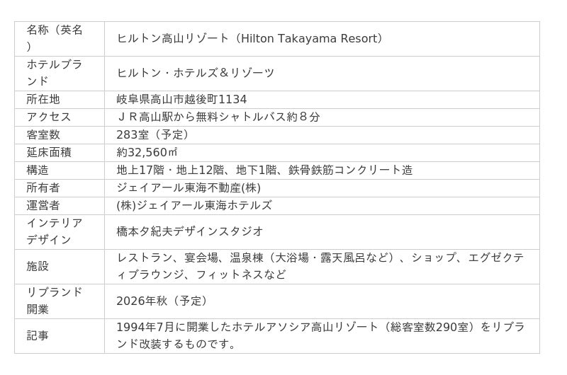 東海旅客鉄道株式会社(代表取締役社長 丹羽 俊介、以下「JR東海」)、ジェイアール東海不動産株式会社(代表取締役社長 谷津 剛也)、株式会社ジェイアール東海ホテルズ(代表取締役社長 伊藤 彰彦)、ヒルトン(米国バージニア州、取締役社長 兼 最高経営責任者:クリストファ J. ナセッタ)は、ホテルアソシア高山リゾートを「ヒルトン高山リゾート」(以下、「本ホテル」)として2026年秋にリブランド開業することをお知らせします。