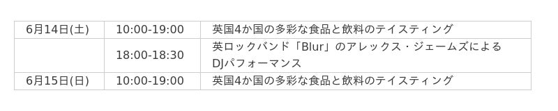 イベント初日の14日(土)には、英国を代表するロックバンド「Blur」のベーシストのアレックス・ジェームズ(Alex James)が出席、DJパフォーマンスを行います。ここでしか味わえない英国のおいしい食べ物やカクテルなどのサンプルをぜひお楽しみください。