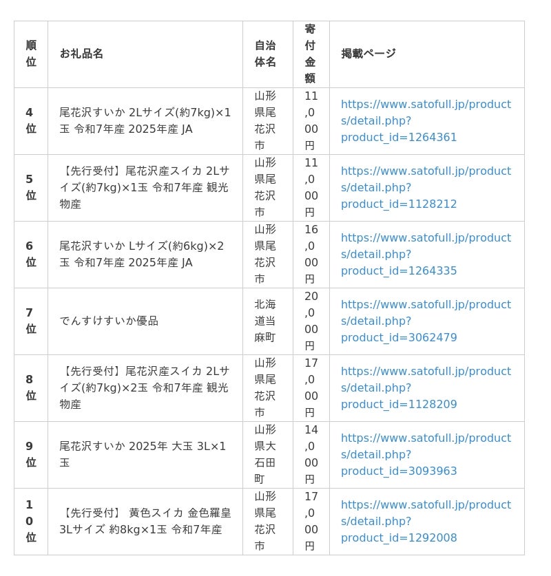2024年「すいか」人気お礼品ランキングTOP10のうち7点が山形県尾花沢市という結果に