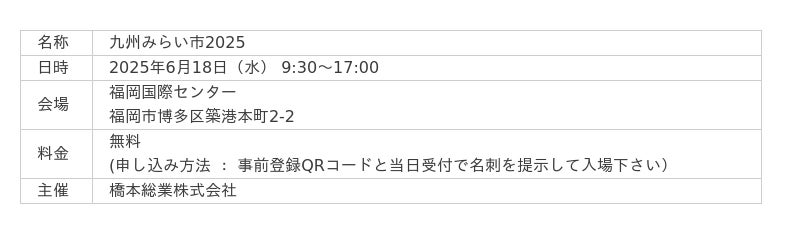 橋本総業株式会社(本社:東京都、代表取締役 阪田貞一)は、管工機材および住宅設備機器の総合展示会である「みらい市」の北海道、東北につづく第三弾として「九州みらい市2025」を、福岡市博多区の福岡国際センターにて、本年6月18日(水)に開催します。