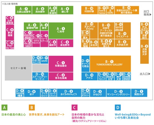 いのち輝く未来を創る4ゾーンにて、54団体106ブースによる出展を行い、「アート・デザイン・サイエンス・テクノロジー・経済の共創~最高峰の日本の美と心~」を世界に向けて発信してまいります。