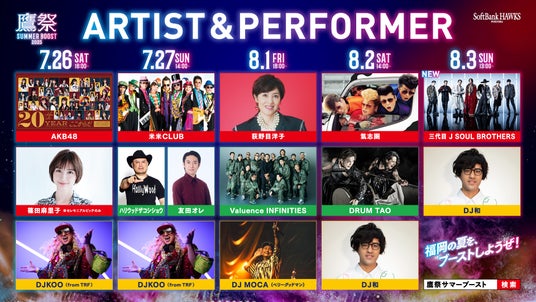 みずほPayPayドームで開催する「鷹祭 SUMMER BOOST 2025(たかさいサマーブースト)」の初日となる7月26日(土)のゲスト「AKB48」の出演メンバー16名が決定しました。今年で20周年を迎える「AKB48」が、ソフトバンクホークス誕生20周年のホークスを熱くブースト!ここでしか見られないコラボを、ぜひ目に焼き付けてください!チケットは販売中です。