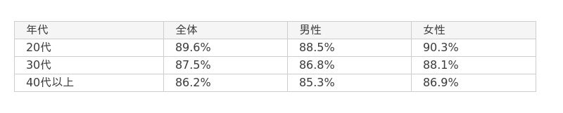 ◦年代:20代38.5%、30代40.7%、40代15.2%、50代以上5.0%、18-19歳0.7%