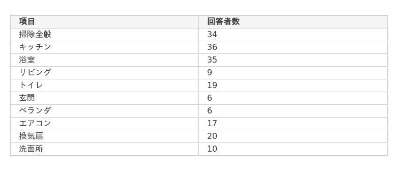 ・掃除の中でも、特に「キッチン」「浴室」の掃除が負担と回答した方が多い。