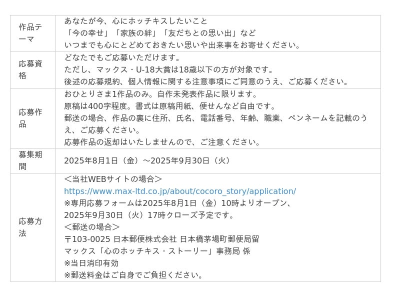 マックス株式会社(証券コード:6454)は、マックス「心のホッチキス・ストーリー」と題し、"あなたが今、心にホッチキスしたいこと"をテーマにショートストーリーを募集します。「今の幸せ」「家族の絆」「友だちとの思い出」など、いつまでも心にとどめておきたい思いや出来事などをお寄せください。