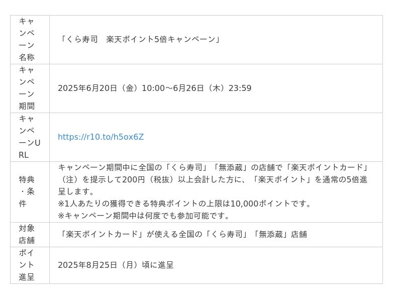 楽天ペイメント株式会社(以下「楽天ペイメント」)は、共通ポイントサービス「楽天ポイントカード」において、くら寿司株式会社(以下「くら寿司」)と共同で「くら寿司 楽天ポイント5倍キャンペーン」を、2025年6月20日(金)から6月26日(木)まで実施します。