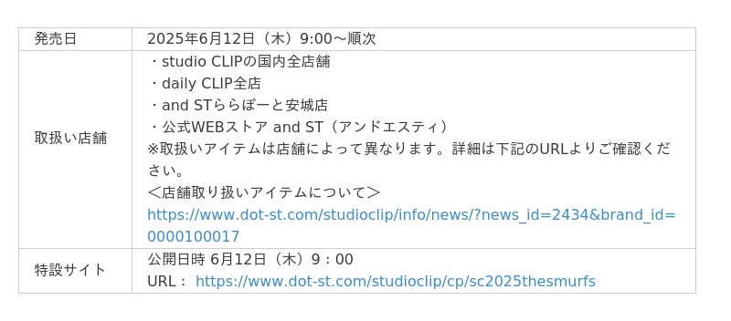 株式会社アダストリア(本部:東京都渋谷区渋谷2-21-1、代表取締役社長:木村 治)が展開するライフスタイルブランド「studio CLIP(スタディオクリップ)」は、ベルギー生まれの世界中で愛され続けている人気キャラクター「THE SMURFS(スマーフ)」とのコラボレーションアイテムを2025年6月12日(木)より公式WEBストア and ST (アンドエスティ)と、studio CLIPの国内全店舗、daily CLIP全店、そしてand STららぽーと安城店で販売いたします。