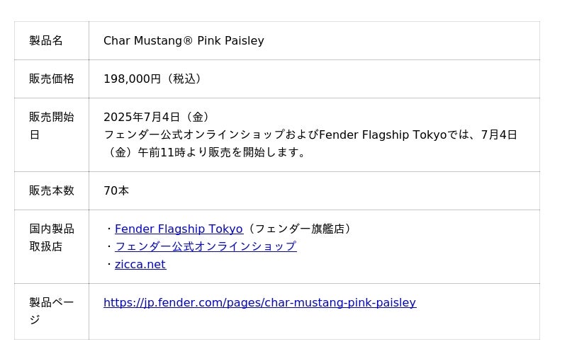 フェンダーミュージック株式会社(所在地:東京都渋谷区、代表取締役社長アジアパシフィック統括 エドワード・コール)は、日本のロック史に多大な影響を与え続けるギタリスト、Charの新シグネイチャーモデル『Char Mustang(R) Pink Paisley』を発表しました。本モデルは、Charの70歳という節目の年にちなんで70本限定で生産され、東京・日本武道館で開催される古希をお祝いするバースデーライヴ の開催日である7月4日(金)に発売されます。Fender Flagship Tokyo(東京・原宿)、フェンダー公式オンラインショップおよびChar公式サイトzicca.netにてお買い求めいただけます。(※フェンダー公式オンラインショップおよびFender Flagship Tokyoでは、7/4(金)午前11時より販売を開始します。)