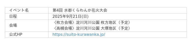 FoodFes株式会社(代表取締役社長:稲垣一馬)は、2025年9月21日(日)に枚方市・高槻市で開催予定の「第4回 水都くらわんか花火大会」のフードエリアをプロデュースします。