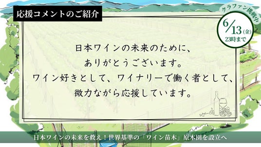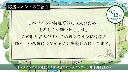 また、この達成金額は国内ワイン分野におけるクラウドファンディングとして最大規模(※JVA調べ)となりました。最終日である6月13日(金)23:00まで引き続きご支援を受け付けております。