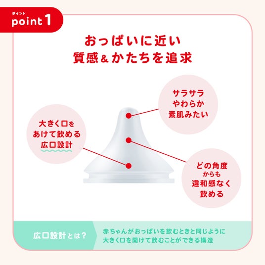 赤ちゃんが自然に大きく口を開けて深くくわえることができる広口設計は、おっぱいを深く吸着する動きをサポートし、健全なあごの発達につながります。