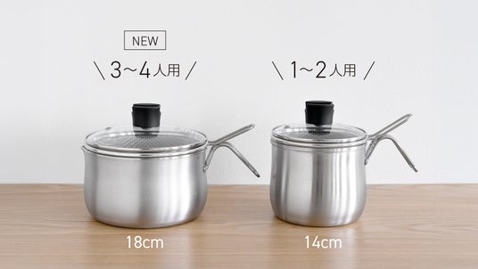 1つで「煮る・沸かす・茹でる・炒める・炊く・揚げる・和える・保存・蒸す」の9役の調理をこなせる強みはそのままに、14cm から18cm へサイズアップしました。