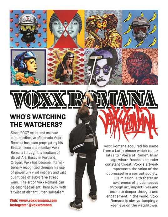 2007年以来、アーティストであり、カウンターカルチャーの接着剤愛好家でもあるVoxx Romanaは、ストリートアートという媒体を通して、自身のアインシュタインの象徴とVoxx Romanaという芸名を広めてきました。オレゴン州ポートランドを拠点とするVoxxは、力強く鮮やかなイメージと膨大な量の反体制的なストリートアートによって、国際的に認知されています。Voxx Romanaのアートは、エレガントなアーバンシュールレアリズムのひねりを加えたアンチヒーローパンクと言えるでしょう。