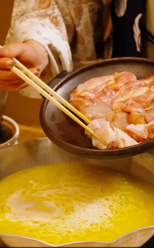 割り下は、昆、鰹節、干し椎茸の出汁に醤油と砂糖を加え、地元・福岡らしい優しい甘さが特徴。博多地鶏のもも肉・むね肉にはそば粉をまぶし、割り下と絡んで一層深い味わいを引き出します。