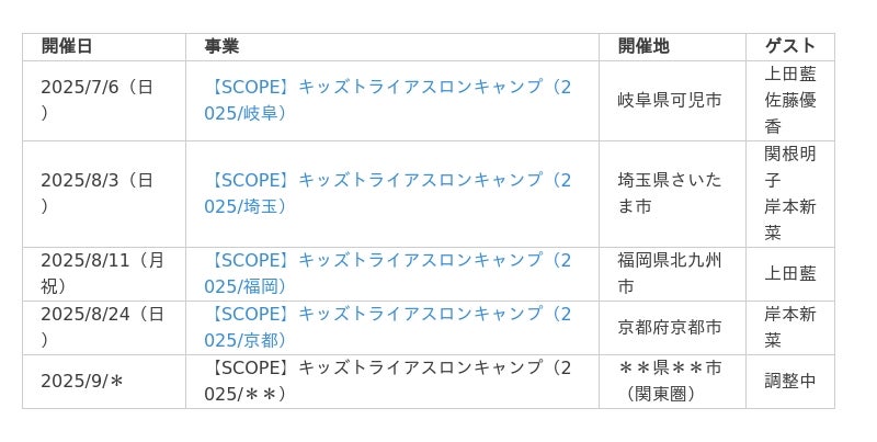 キッズトライアスロンプロジェクト「SCOPE」の第1弾、キッズトライアスロンキャンプの日程と開催地を発表します!キャンプでは、オリンピアンとの交流やトライアスロン3種目の体験を中心とした多様なアクティビティを通じて、こどもたちが主体的に"する・みる・ささえる"スポーツ体験を楽しみながら学ぶ機会を創出します。