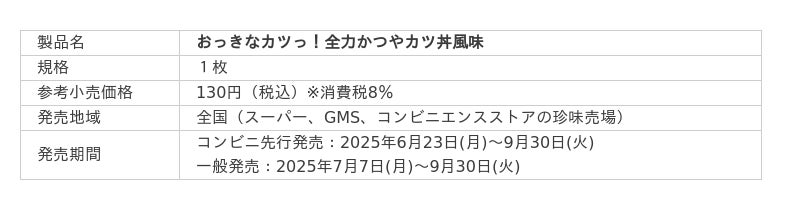 株式会社なとり(本社:東京都北区 会長兼社長:名取三郎)は、「おっきなカツっ! 全力かつやカツ丼風味」を6月23日(月)より期間限定で新たに発売いたします。